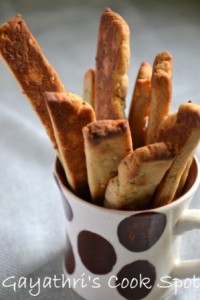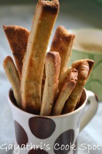 Today is the second day of BM#10. I am posting under guilt free snacks. I saw the original recipe in a book which accompanied my oven. It had loads and loads of butter and maida. I adapted the recipe to prepare these tasty and crunchy sticks. I used olive oil instead of butter and also reduced the amount of oil by half. Atta went into the dough instead of maida. We enjoyed it with our evening coffee.
