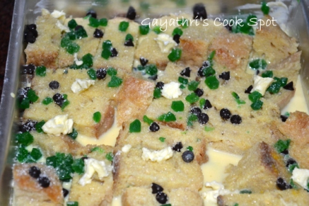 After preparing the French Country Bread with sourdough starter for The Daring Baker Challenge, the question of how to use it arises. I made this delicious pudding with one whole bread. This is an eggless version and it is loaded with chocolate chips. It tastes great and makes a great breakfast / evening snack. I have used alot of milk because the bread was dense. If you are using store bought soft bread then reduce the quantity of milk and custard powder.