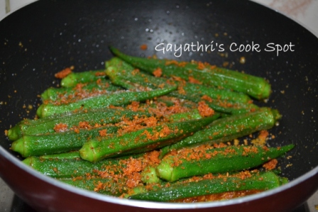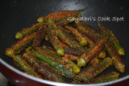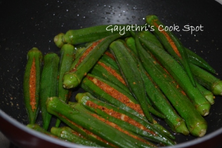 5. Heat oil in a non stick pan and add the stuffed okras.