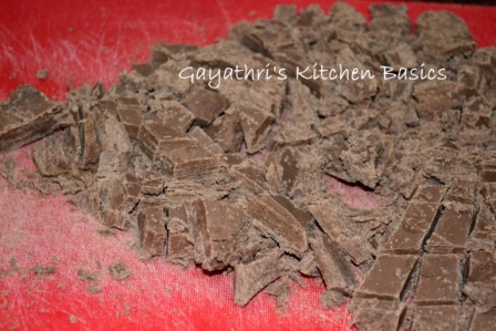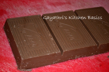 Line a plate with a butter paper, transfer the chocolate to it. Press with the back of a spoon to smoothen the top. Allow it to cool for 2-3hours. It will become a hard block. Place it in a zip lock and leave it on the counter over night.