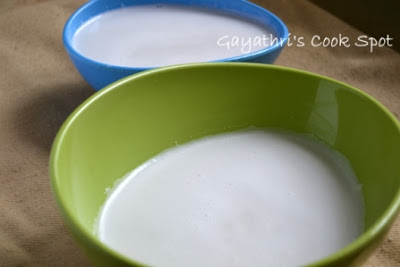 Strain the first milk using a nylon strainer. Keep it aside. Add another cup of water to the coconut and grind it again. Strain this as the second milk. Repeat it once again to get third milk. Discard the remaining coconut.
