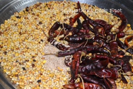 Ingredients: Urad Dhal(Ulundamparuppu)-1cup Channa Dhal(Kadalai Paruppu)-1/2cup Toor Dhal(Thuvaram Paruppu)-1/2cup Salt-to taste Red Chilly-50gm (adjust according to your taste) Hing(Perungayam)