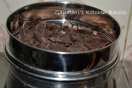 While preparing chocolate based sweets, it is very important to melt the cooking chocolate before you start preparing the sweet. Cooking chocolate is available in thew form of bars. So first chop[ it up with a sharp knife on a chopping board. Chocolate should not be kept directly on flame because it is very delicate. The flame will spoil the chocolate. So always use a double boiler.