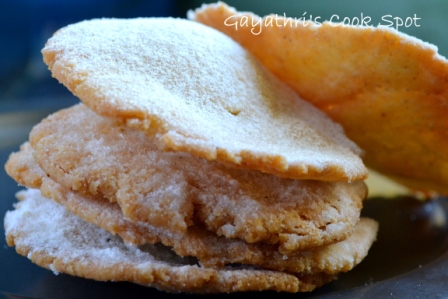 Pathir Peni also known as Chirotti or Peni is a crispy sweet made of rava or maida. I have posted a recipe- Chirotti using maida and sugar syrup. When Srivalli announced the ICC for this month, I wanted to try out the rava version. Harini shared the recipe with Srivalli and in turn Srivalli shared it with us. The peni/ chirotti turned out very flaky. I sprinkled powdered sugar on top and it was so nice. This can be stored in air tight jar to retain the crispness. The recipe uses chirotti rava which is a fine rava. But those who don’t get chirotti rava ( just like me) grind the ordinary rava in mixer grinder to make it finer. In Karnataka, chirotti is served along with badam milk in functions.