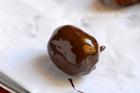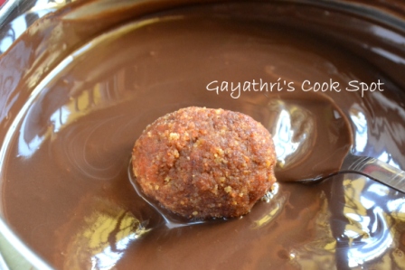 8. Drop a ball into the melted chocolate and coat it completely with the chocolate. Use a fork or spoon to do this.