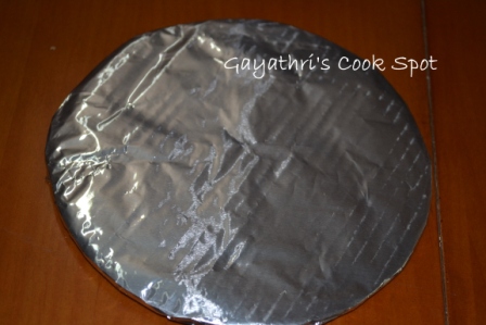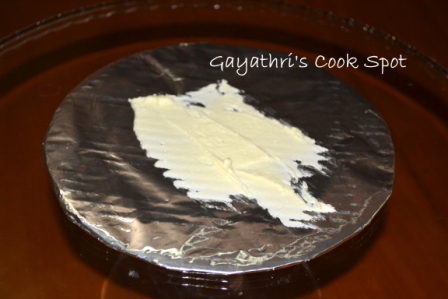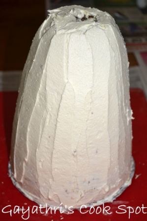 Now apply generous amount of butter cream and smooth it with a spatula. Allow it to dry for 1hour. The cream should not stick when touched. Use a plain tissue paper to smoothen out the surface.