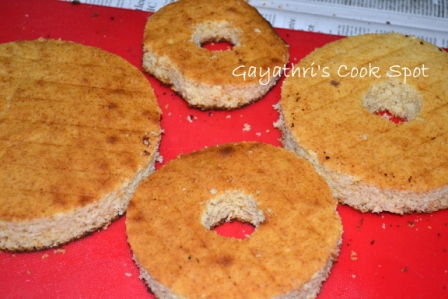 Leaving the 16cm vanilla cake, cut a circle of 2 1/2″ in the centre of the remaining circles.