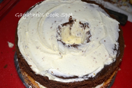 Prick the cake with a tooth pick all over and brush the cake with syrup. Add butter cream and spread it with a spoon or spatula. Place the chocolate cake on it.