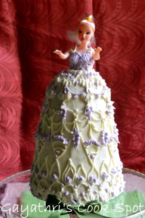 Sruti celebrated her birthday on Feb 5th. For the past 2-3months, she is giving me ideas of cakes I have to prepare for her birthday. The cake which always stays in the list is the barbie cake. I have done this cake for her 3rd birthday. So I set on preparing the cake the previous day. In Tamil Nadu, the power supply is unpredictable. While I was baking a cake, there was a power shut down, and I couldn’t use it in the barbie cake. So I had to send my hubby to shop for another set of ingredients. I prepared two sheet cakes and used it in the main cake. This was easy compared to baking in small pans. I also prepared a rectangular cake for the candle blowing. I am giving a step by step instruction for the barbie cake here. Sruti loved the cake so much. We invited some of her friends and they were praising the cake a lot. Sruti was so proud to have two cakes for her birthday. Though this may not be a perfect cake, it indeed made my daughter happy.