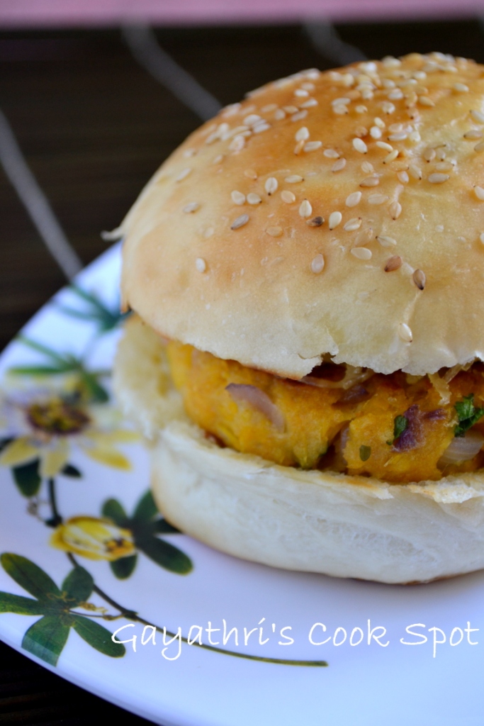 This month’s challenge at Daring Cooks is Flipping Fried Patties. The hosts of this challenge is Audax of Audax Artifex and Lisa of La Mia Cucina. Both challenged the daring cooks to try out patties otherwise known as cutlets or burgers. They left the choice of the ingredients to us. So I made these sweet corn patties or cutlets. I used bread slices for binding. I also pan fried the cutlets instead of deep frying them. The ingredients given in the recipe yields 4 cutlets. I also made a burger using home made burger bun. The recipe for the bun will be posted soon. The cutlet was slightly sweet because of the sweet corn. It was firm but soft and delicious.