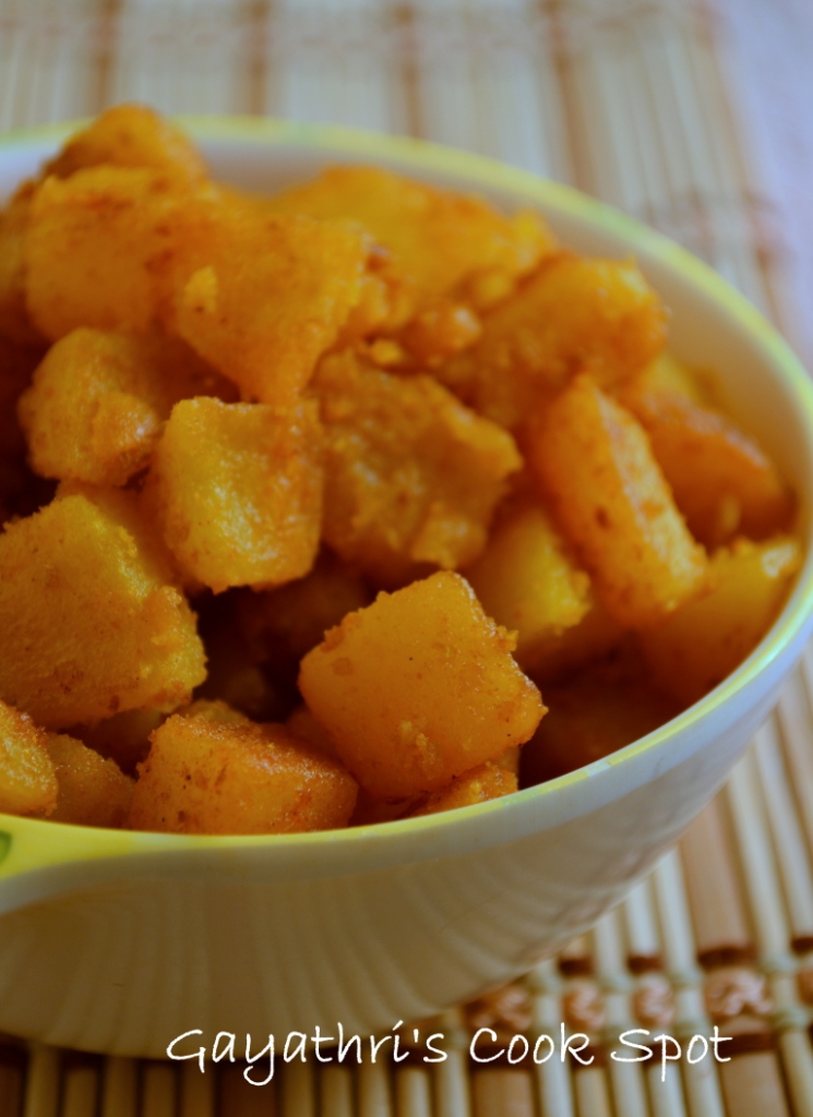 This is a great side dish for rasam saadam or paruppu saadam. My daughter is a fan of potato roast and I prepare it with out red chilly powder for her. Adding red chilly powder makes it hot and delicious. It is simple to prepare and can also be paired with curd rice or rotis.
