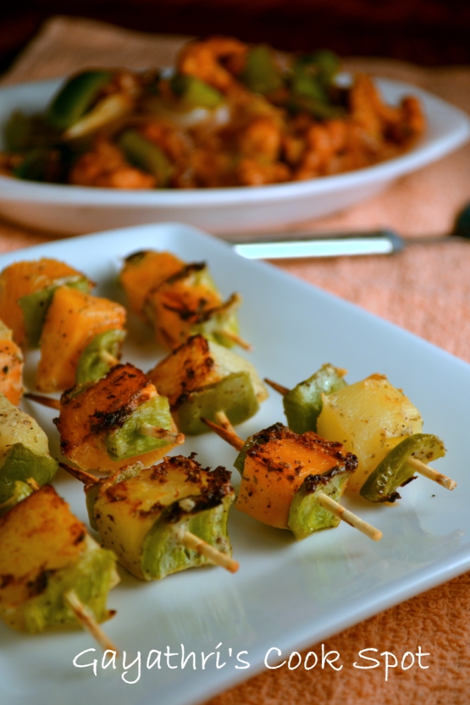 11. Insert the marinated vegetables in a tooth pick. Sandwich a potato piece between two capsicum squares.