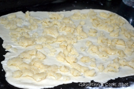 10. Spread one part of the filling evenly on the rolled rectangle.
