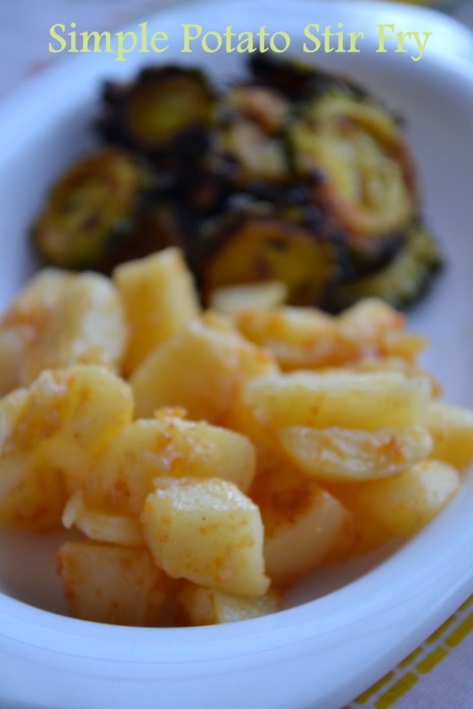 Today is a simple lunch which includes my daughter’s lunch box dishes and a stir fry for us. She took mangai saadam to school along with her potato stir fry. I prepared the potato to suit her taste. We had it along with bitter gourd roast. There was a bowl of cucumber slices to cool the heat and of course, curd and pickle along with plain white rice to complete the meal. It was simple yet satisfying.