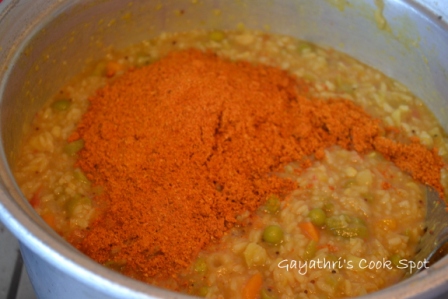 15. When the rice becomes mushy and tamarind smell is gone, add the spice powder and cook for a minute.