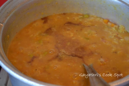 Add vegetables, dhal, turmeric and 1tsp of oil along with 2 1/2 cups of water in a pressure cooker.