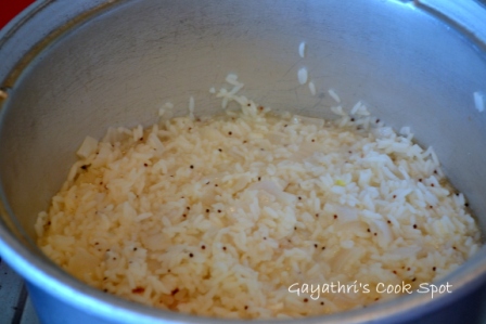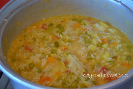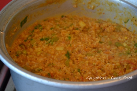 11. Add the cooked dhal vegetable mixture to the rice and mix well. After adding dhal you should be very careful because the dhal sticks to the bottom if unattended.