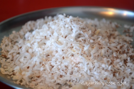 16. Add the copra and coriander leaves, give a final mix and remove from flame. The rice will be slightly runny when hot.