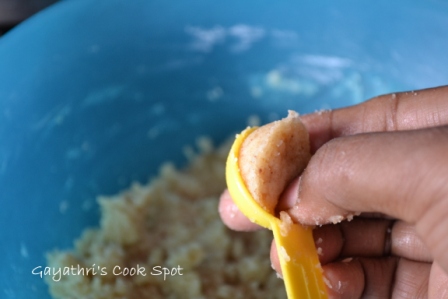 7. Take a teaspoon and fill it with the dough mixture. Pat it and smoothen the top.