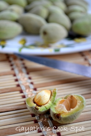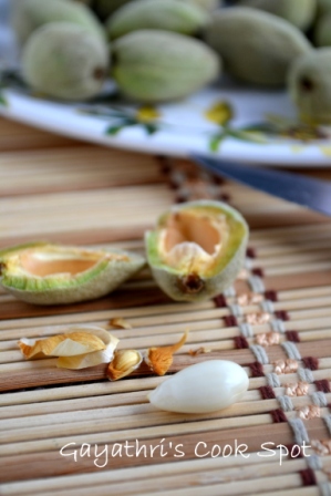 These are the fresh almonds. At first I thought I had to use it as whole in my cooking. But after going through some sites, I learnt that only the nut is used and the remaining discarded.