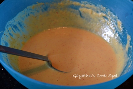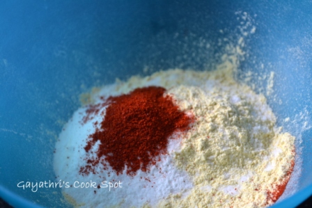 1. Add salt, 1tsp red chilly powder, rice flour to besan and mix well.