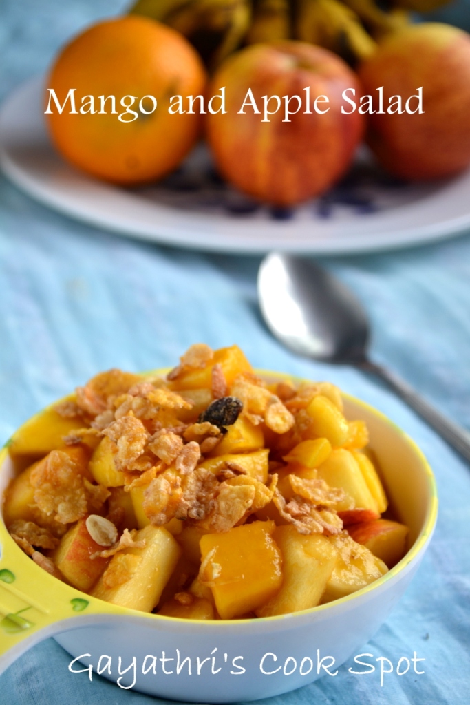 When doing salad theme, I wanted to include a fruit salad. Today is the third day of Blogging Marathon-third week. This fruit salad tastes great when chilled. I added some corn flakes on top for a nice crunch. You can also serve it with a scoop of mango ice cream. I made a dressing with orange juice and dates syrup. When kept aside for 15minutes, it blended so well into the salad. So if you are serving guests, give atleast an hour of resting time for the salad. The soft mangoes, crunchy apples and crunchy corn flakes made it a delicious salad. This is a very easy salad and best for this summer.