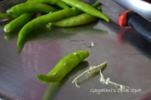 6. Heat oil in a pan. Dip the green chillies one by one in the batter, roll over to coat it completely with batter and drop it carefully into hot oil.