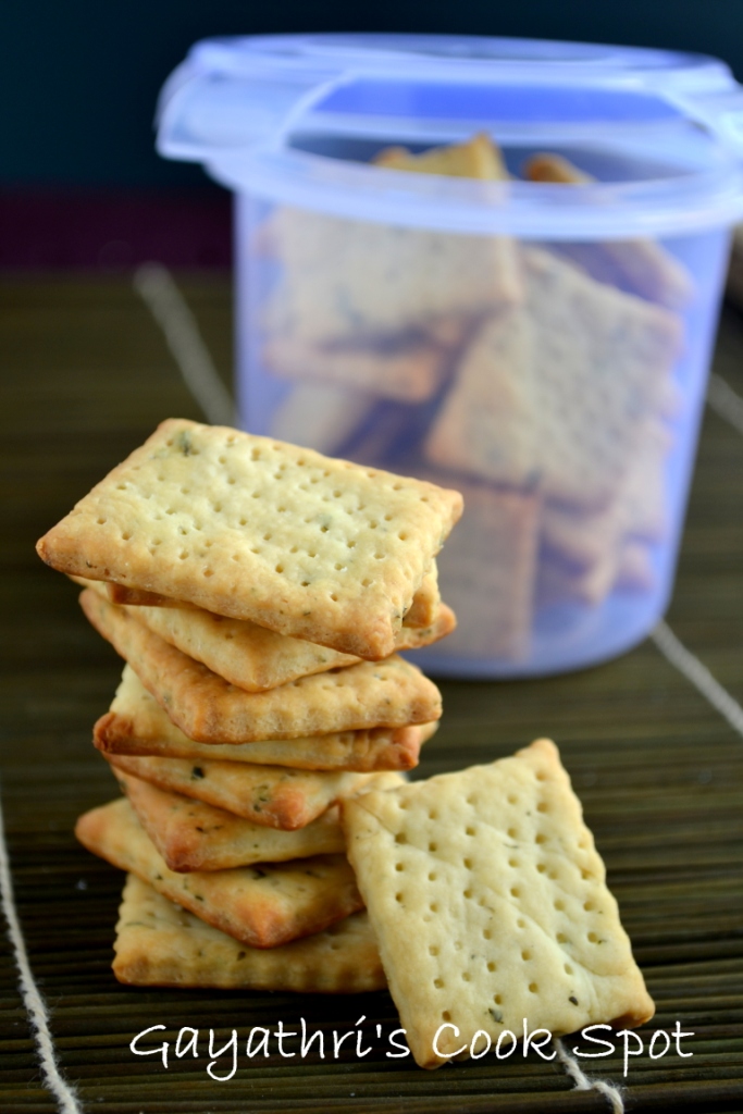 This month’s Daring Bakers’ Challenge is Crazy For Crackers. The host Dana McFarlane, a non blogger challenged the daring bakers to bake crackers. I have posted 3 cracker recipes before. I have been trying to get the perfect cracker for a while. Since I love the Britannia cream crackers and it is also my daughter’s favourite, I wanted to recreate those crackers at home. This time I nearly succeeded. The taste is very near to the store bought cream crackers. For fun I added dried basil to the dough and the result was amazing basil falvoured crispy crackers. I am very happy with the result. My daughter couldn’t stop munching these crispy crunchy crackers.