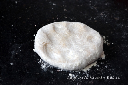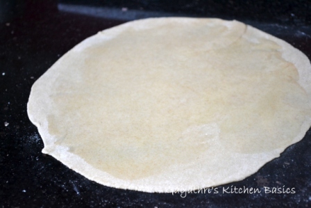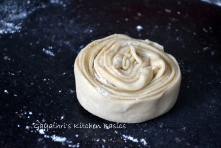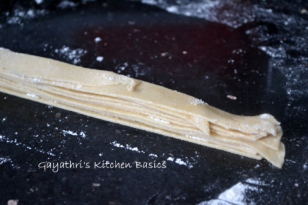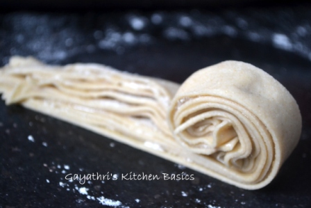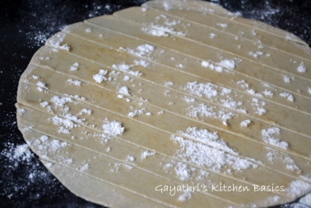 Today I will share another method of layering parathas. This involves cutting the whole rolled out disc into small strips and then stacking them. This is done in the preparation of lacha paratha. You can either use ghee or oil to apply on the rolled out disc. I have used wheat flour for sprinkling but you can also use rice flour. The dough used is the chapathi dough(click to view recipe) which I have posted earlier.