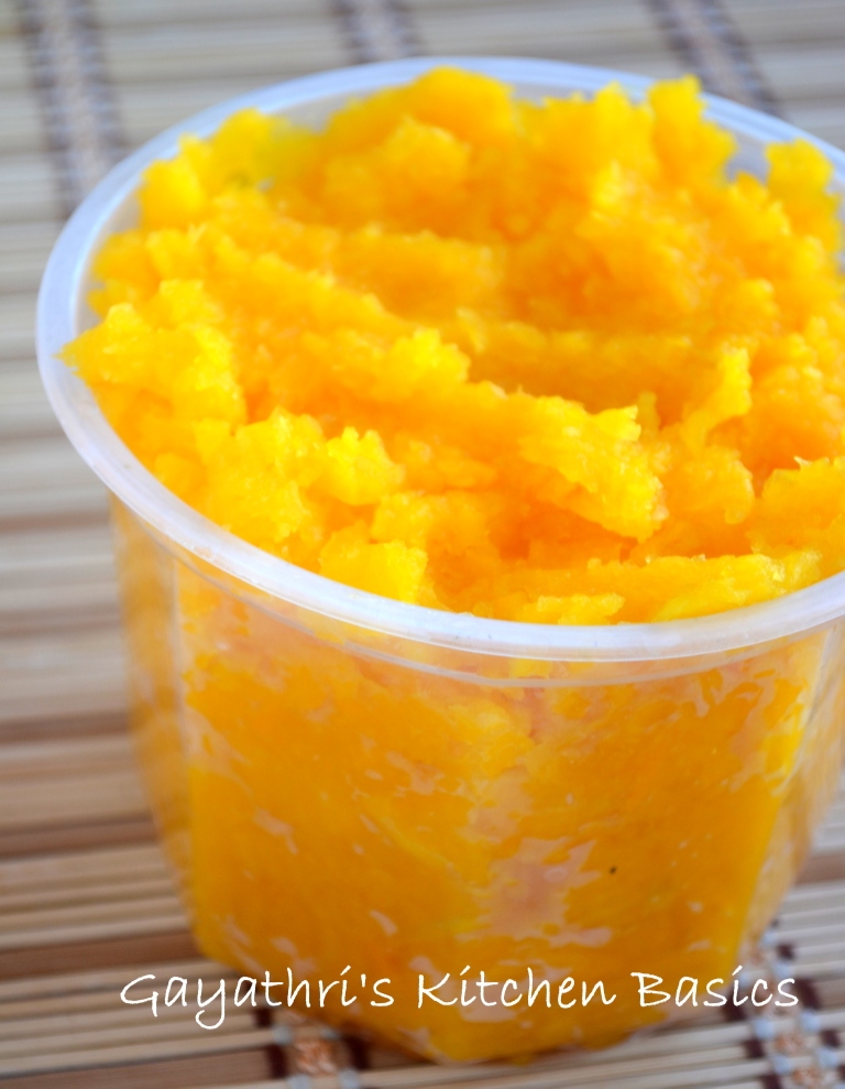 I normally stock pumpkin in my freezer. There are two to three types of making the pumpkin puree. This is one of the methods. Pumpkin puree can be used to make parathas, pulao, kheer and many more delicious baked dishes. Grated pumpkin can also be frozen in zip lock bags. The preparation is quite easy and hassle free.