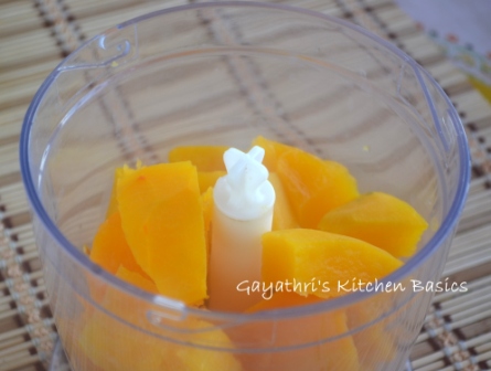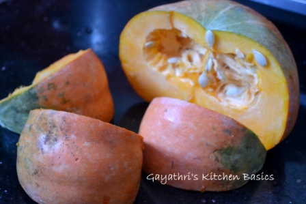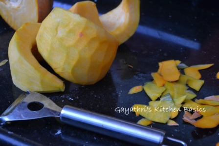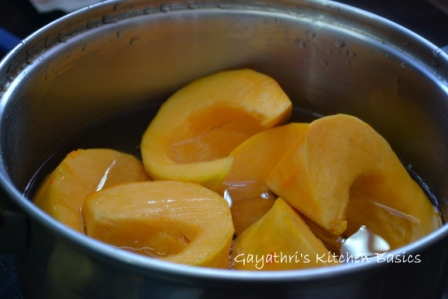 For the puree add water and pumpkin wedges in a pan. Heat it. Cover the pan with lid. When the water comes to boil, switch flame to low and allow it to cook until a tooth pick can be inserted easily into the pumpkin. It must be soft. It takes 30-45minutes.