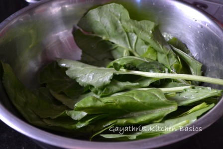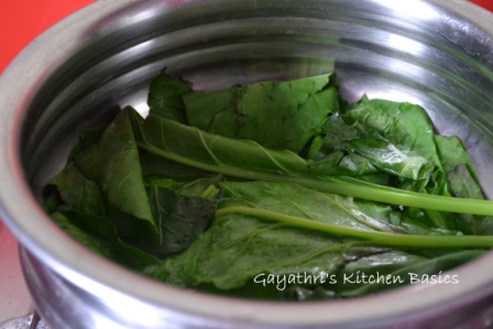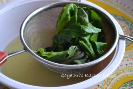 Switch off stove and close the lid for 10minutes. The leaves will wilt by the time. Drain the water. Do not discard water. You can use it to make chapathi dough.