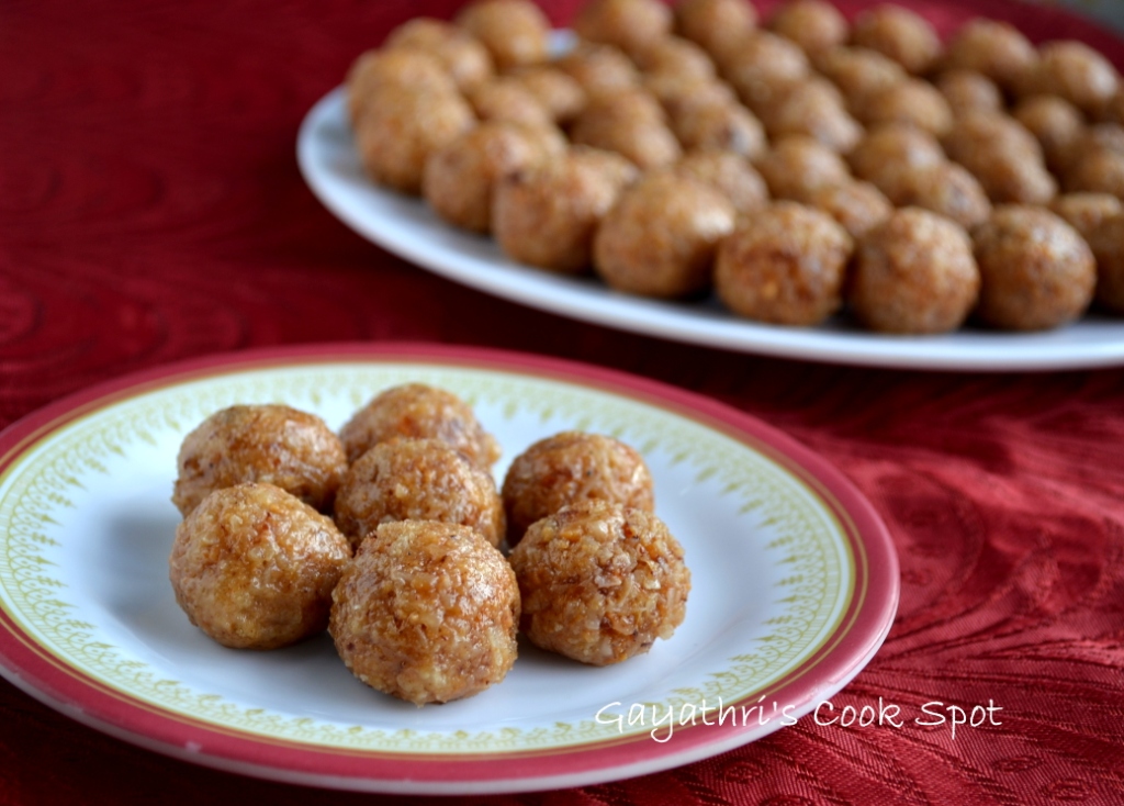After finishing Varalakshmi Vrath, the coconut placed in the kumbum has to be used to prepare a sweet. I had paneer, mawa and dates at hand and so I prepared these delicious balls including all the ingredients. The usual thengai urundai doesn’t contain paneer or dates in it. But after tasting these I will never miss adding them in the future. At first I started preparing burfis but after I poured the mix into the tin and waited for it to set, I was disappointed. It didn’t become firm ( I didn’t have patience. If left for 2hours, it would have made great burfis too!!) So I removed it from the tin and made these cute balls and place it on a plate. I allowed it to air dry for 2 hours and they became firm. When you take a bite, it is crispy on the outside and slightly juicy and syrupy inside. We loved it. I also shared it with my SIL and FIL when I visited them.