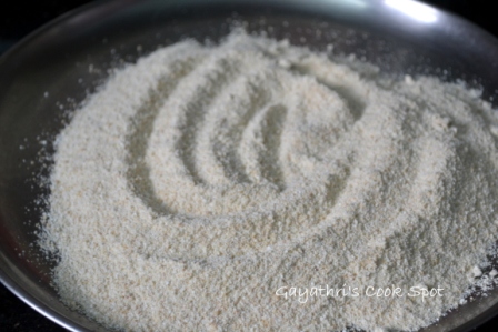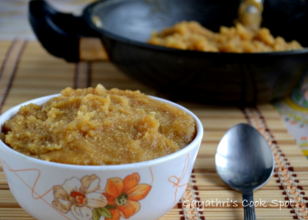 For this month’s Indian Cooking Challenge, Srivalli chose Ulundangali ( Urad dhal halwa which uses sesame oil. She gave us two recipes to try. I opted this recipe which uses equal quantities of rice and urad dhal. This kali is given to girls at the time of puberty. It is also a great medicine for those suffering from back ache. My aunt used to prepare this and once when I suffered from back ache, she prepared the flour for me. I prepared the kali and had it when ever I was hit with ache and there was a great relief. I haven’t asked her about the proportions. I followed Srivalli’s recipe and the result was great. It was delicious as I added 2 tbs of ghee along with sesame oil. If you want to make it as halwa, just substitute the sesame oil with ghee and add some chopped roasted nuts. It will make a great dessert. Actually jaggery/ karuppatti is used. But I have used brown sugar/ vellam. You can also used sugar instead. The taste varies according to the sweetener used.