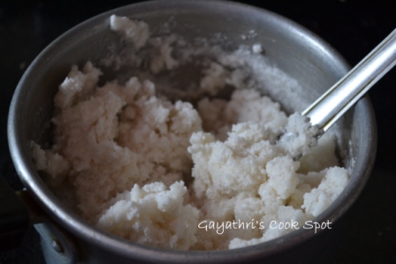 3. Add the rice flour and mix vigorously with the back of a ladle so that the flour mixes uniformly with out any lumps.