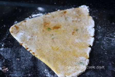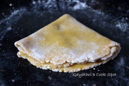 For this month’s Indian Cooking Challenge, Srivalli gave two recipes for Indian Flat breads from Haryana cuisine. The recipe for this roti is from the renowned chef Sanjeev Kapoor. I will be doing the other recipe later. This roti as the name suggests is made of besan or gram flour and has a masala filling inside. The roti is shaped in triangular shape and was very easy to prepare. The recipe uses ghee but if you want you can always go in for oil instead. But I tried it with ghee and the roti was very flavourful. The masala filling was so tasty and it didn’t need any side dish. Though I served it along with a gravy, I prefer to eat it along with some curd.