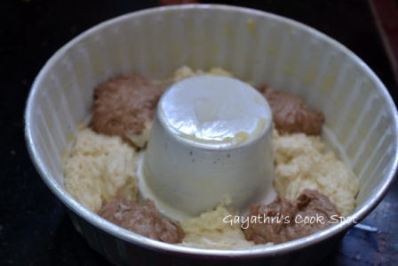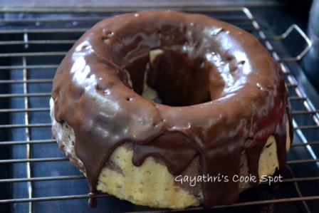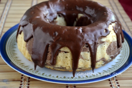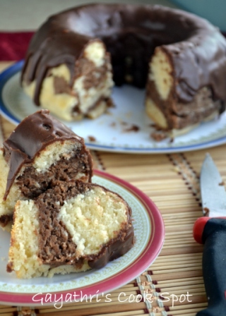 For the third day of  the final week of Blogging Marathon#20 I decided to make use of the fluted tube pan I bought from Chennai. Though I have posted many cake recipes, I haven’t yet posted the marble cake. So I tried it out today. The cake was not so pretty. I should have used a knife to make the marbling pattern instead of tooth pick. But the taste was absolutely delicious. The cake is slightly sweet and the icing balances the sweetness needed. I used cocoa powder icing but if you want a chocolaty version you can go for melted chocolate. My daughter had a small piece and she enjoyed it a lot. I also enjoyed baking in my new pan. I am linking this to Srivalli’s Kid’s Delight- Party Specials.