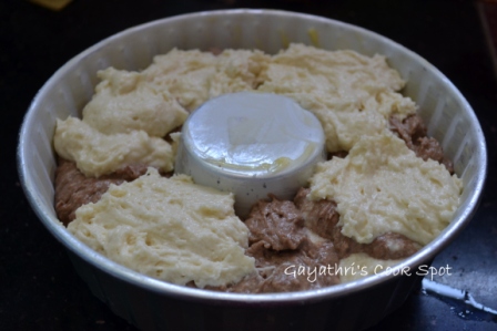 10. Add another layer of batters by placing chocolate batter on vanilla batter and vanilla on chocolate.