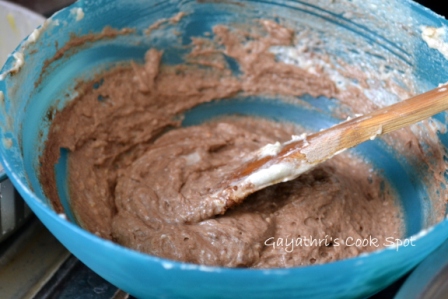 7. Divide the batter into 2 equal portions. To one portion add cocoa powder and 1/4cup of milk and mix to combine.