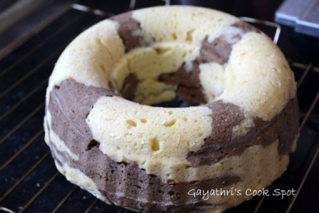 The cake needs a little bit more time in the oven. And for the marbling part, it all depends on how you swirl the batter. As the icing is full of icing sugar, it would be sweet. You can decrease the amount of icing used or go for a non iced cake if you feel it very sweet.