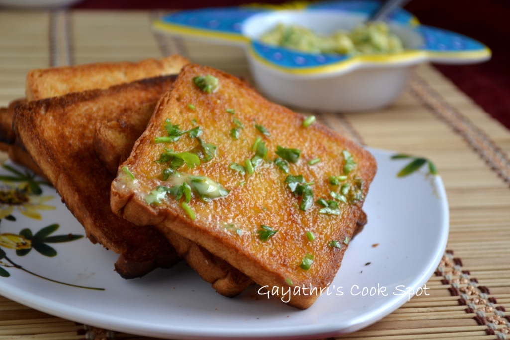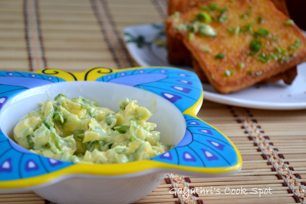 For the second day of Blogging Marathon Week 2 I tried out this wonderful spiced butter as a spread for my toasts. If I have to choose between the pumpkin spread and this herbed butter, I would go for this yummy butter. With a slight hint of garlic and fresh coriander this butter tasted delicious on the golden bread toasts. This will go very well with a cup of coffee for your breakfast or as a tea time snack. I used the powdered garlic flavoured with parsley with chopped coriander. I also added some salt. If you want a spicy butter, you can add some chopped green chillies or red chilly flakes. There is no particular recipe for this butter and you can whip it up in seconds. Prepare your bread and when it is toasting the oven, you can prepare the butter so that it goes directly on the hot bread slice.