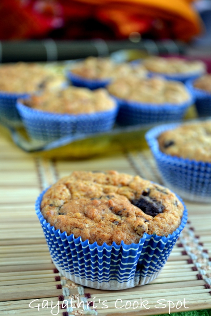 For this month’s Baking Partner’s Challenge, Swathi selected cupcakes using pumpkin. She gave us three recipes contributed by the members of the group. We can choose to do any recipe and I chose pumpkin and chocolate chip cup cakes suggested by Reshmi of Easy Cook. The recipe is from Joy Of Baking and as usual I changed it into an eggless recipe by substituting the egg with curd. I prepared them when my two SILs visited me along with their children. So the cupcakes vanished with in a day. They were spicy and delicious. As I didn’t have chocolate chips, I went for chopped chocolate. We enjoyed it so much.