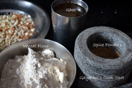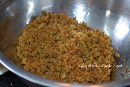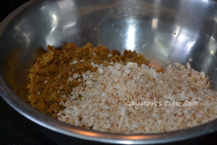 - Add a tsp of ghee and roast the coconut until golden. Add it to the roasted methi in the bowl.