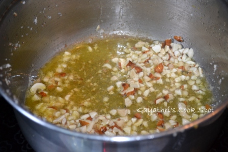 - Add 1/4cup ghee to the same pan and add chopped nuts.