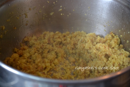 - In the pan add the soaked methi powder and fry until it becomes crumbly.