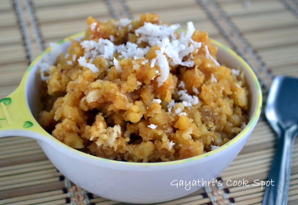 Today is the second day of Blogging Marathon #21 and the dish today I am posting is a Chettinad speciality. Chettinad cuisine is famous for its delicious and unique recipes. This puttu is one among them. I saw the recipe in a cook book. I also had an opportunity to taste this puttu from my neighbour. It was so nice and so I decided to try it out. As I had guests three weeks back, I decided to prepare it for them for the evening snack. Though the result was not as tasty as the puttu I tasted before, it was some what similar. As I didn’t have an idli plate to steam cook the moong dhal batter, I used a cake tin to cook it. That was the mistake I made. The puttu was a bit lumpy. Next time I would make it properly so that it crumbles well.