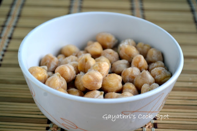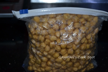 If you have an unexpected guest at home, it is very hard to make chickpea based dishes because it needs a lot of soaking time. But chole and bathura makes a nice dinner meal. I always have a bag of frozen chickpeas in my freezer so that I can whip up a chole based dish within minutes. I just soak up the chickpeas and put it in freezer bag and freeze it. At the time of cooking you can get the required amount of the frozen chickpeas and pressure cook them for 5 minutes to get freshly cooked chickpeas.