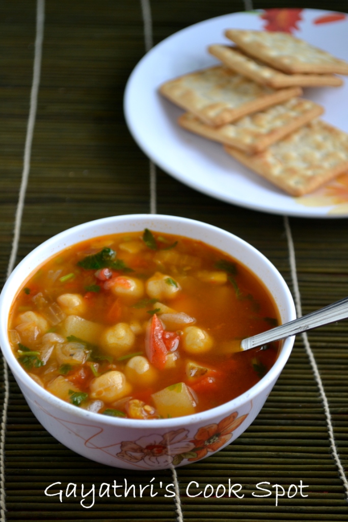 Today is the first day of Blogging Marathon#22, Week 3 and I will be posting under cooking with chickpeas for three days. I saw this recipe at tarladalal.com. This is inspired by Lebanese cooking and it also uses Baharat powder-a spice powder used in Arab countries which is equivalent of our garam masala powder. All the members of the family are suffering from severe cold and this soup soothed the sour throat. It is spicy and hot and is perfect for this chilly weather. I served it along with crackers and it was very filling soup as it has chick peas and potato cubes.