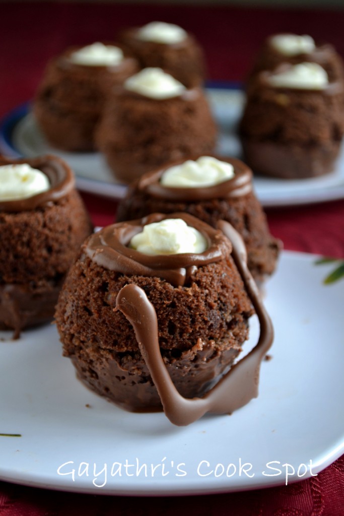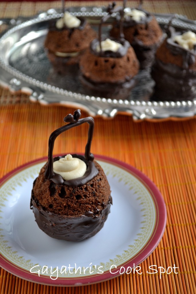 For this month’s Baking Eggless Group Challenge, Archana of The Mad Scientist’s Kitchen suggested Cauldron Cakes. I haven’t heard of these cute cakes until the day Archana mentioned about it in a mail. She also gave me a link to the post. I was stunned at the snaps in the blog. So we at baking eggless group tried recreating these cakes this month. This is the cake which features in Harry Potter series. Those who are fans of Harry Potter must be familiar with these cakes. Though I have watched all Harry Potter’s movies, I haven’t read a single book in the series and so I was clueless. I tried these cakes two times. The first time I tried wit with Dairy Milk chocolate as I didn’t have stock of bitter sweet chocolate. I also used banana as the egg substitute. The cake came out soft but it had a lot of banana flavour. But when I gave the chocolate coating and whipped cream filling, it tasted awesome. But I couldn’t get the handles properly. So my first attempt of the cake was with out handles and I was not satisfied with the end result. Though it tasted great, it was not so good to look at. My daughter loved these cup cakes and didn’t allow us to have a bite. For the next batch I bought home bitter sweet chocolate and tried it once more with some changes. I used apple puree instead of eggs and these cakes were softer than the first attempt. I was also able to make handles. Though some broke, I made extra ones so that I could attach handles to all the cakes I made. I shared this batch with guys and girls working in our office. They liked it very much. As my daughter was out of town she didn’t taste it. As I am typing this post she saw the snaps and was shocked that mom didn’t give her any of these. And she is begging me to do it tomorrow. SO I think this is the success of my bakes. Am I right??