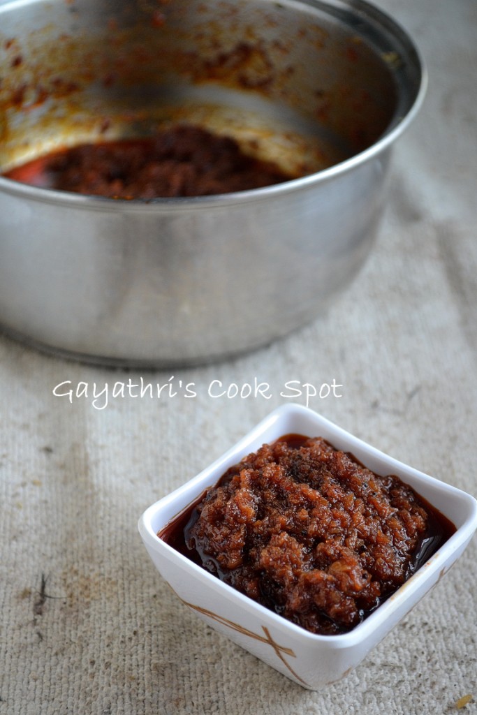Grind it in a hand mixer to a coarse mixture. Make pickle as given in the recipe.